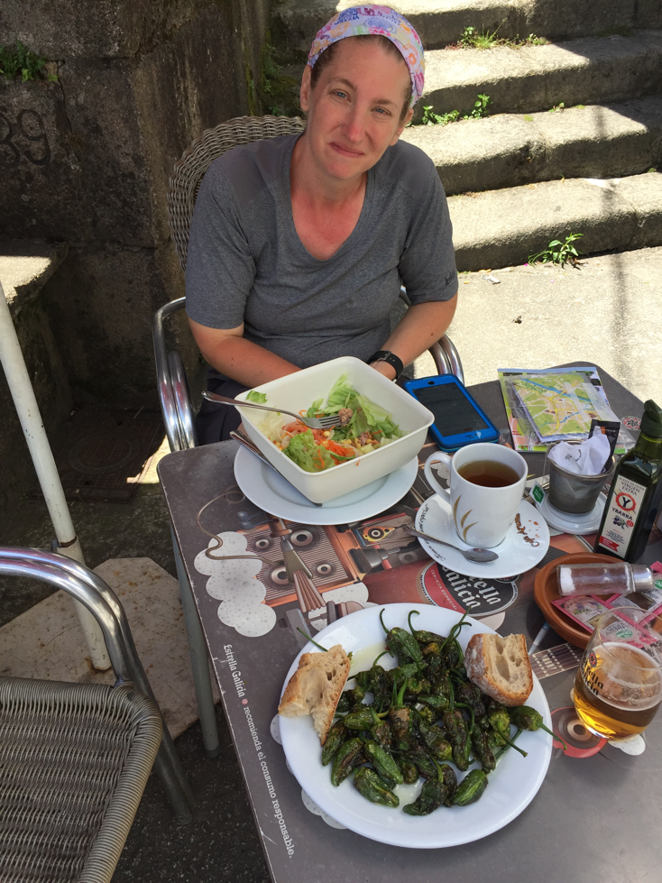 Finally we arrive and after settling into the albergue we find a shady table to enjoy a late lunch. Helen chooses a salad while I opt for the famous Padron peppers. A small sweet pepper fried in olive oil and with course salt. Occasionally one will be spicy but you never know which one so it also adds to anticipation to eating them!